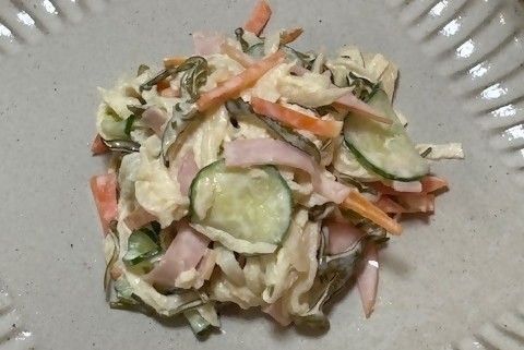 切り干し大根、にんじん、茎わかめなど食物繊維の多い食材を使っています。歯応えが残るくらいの硬さに茹でるのがポイントです。 【材料】(4人分) ハム(...