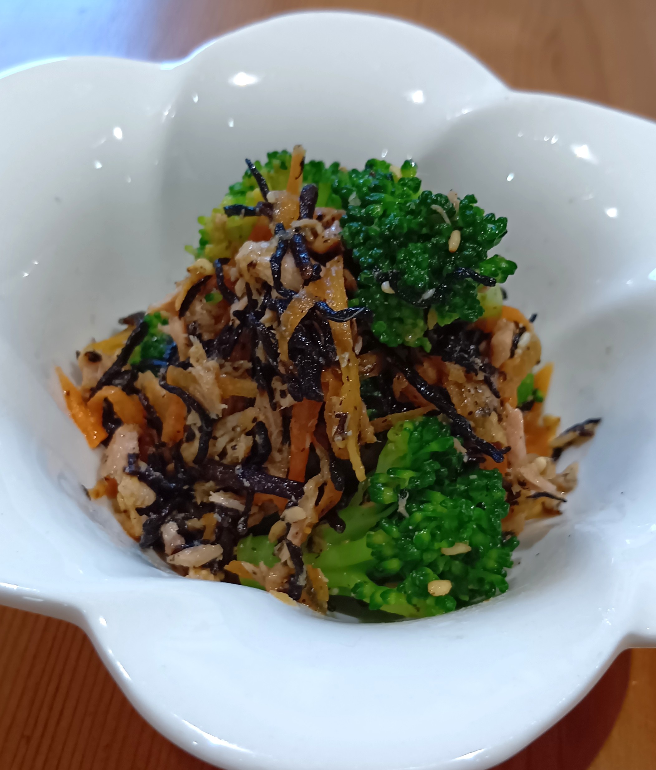 【1】ひじきは水で戻し、にんじんは千切り、ブロッコリーは食べやすい大きさに切る。