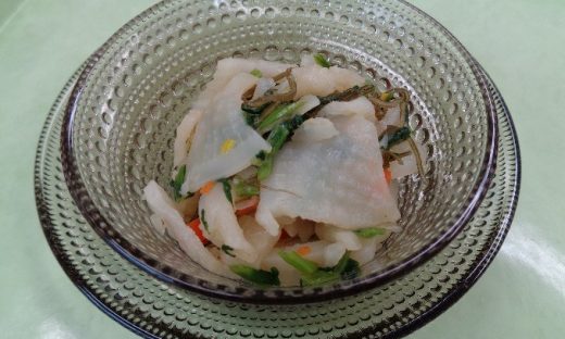 ちりめんじゃこをだしの煮干の代わりに使い、取り出さずにそのまま食べます。甘いさつまいもの入った元気汁は子ども達に好評です。