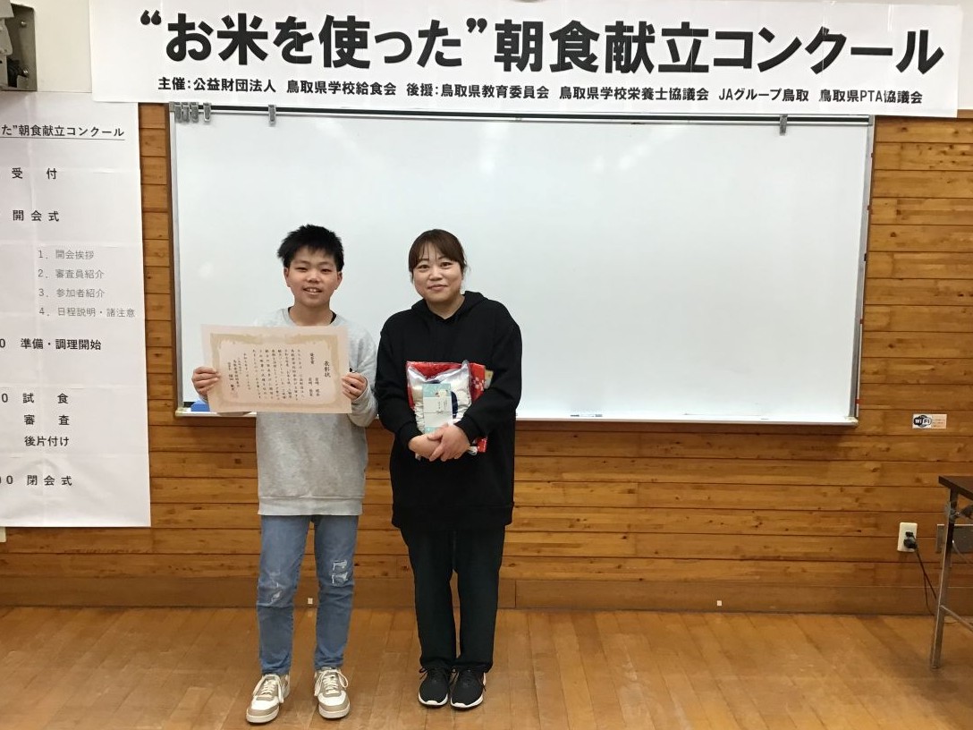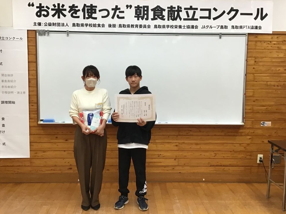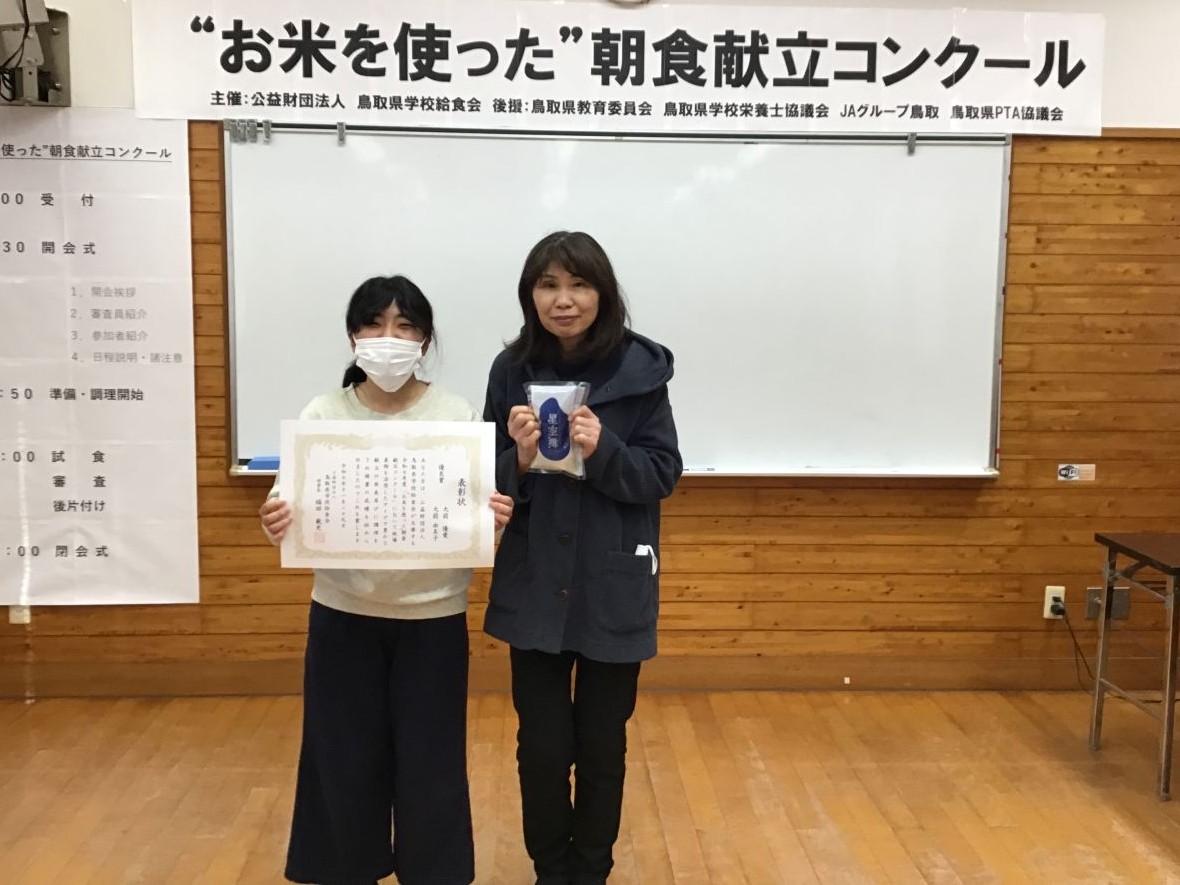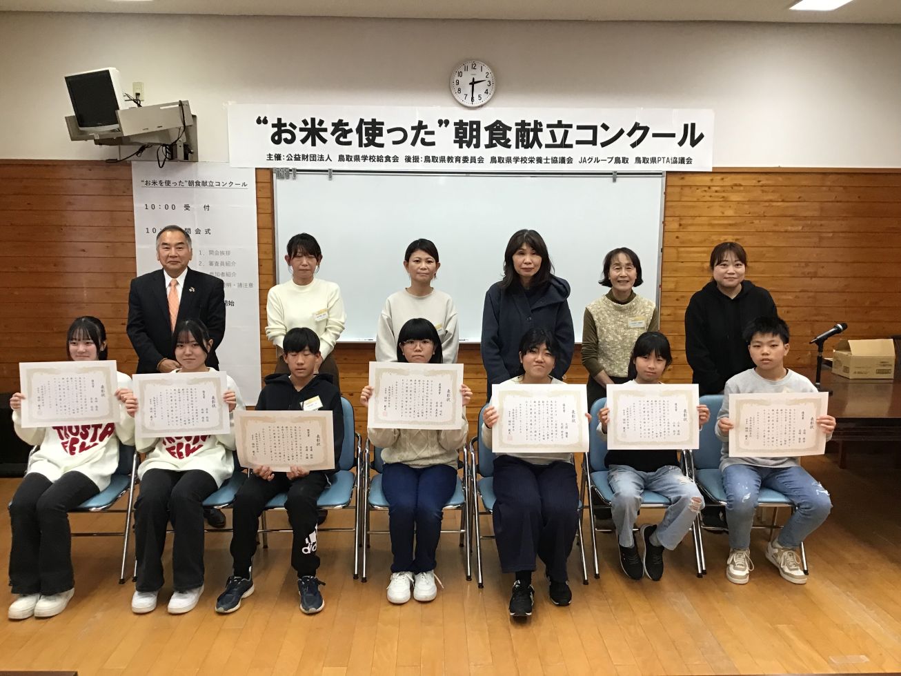朝食献立コンクール 令和7年度お米を使った朝食献立コンクール開催報告(2025年度) 2026.02.04 『❝お米を使った❞朝食献立コンクール』 令和7年11月29日(土)開催 主催:公益財団法人鳥取県学校給食会 後援:鳥取県教育委員会・鳥取県学校栄養士協議会・JAグループ鳥取・鳥取県PTA協議会 倉吉市の伯耆しあわせの郷にて、令和7年度“お米を使った”朝食献立コンクールを開催しました。このコンクールは、毎年、応募対象者を鳥取県内の小中学校の児童・生徒とし、栄養バランスや朝食にふさわしい献立であることなどの条件をおいて、夏休みの期間に参加募集を行っています。本年は、昨年を上回る181組もの応募をいただき、その中から書類審査を経て選考された6組がコンクールの献立調理審査へ出場となりました。 東部の鳥取市から西部の米子市・境港市まで様々な地域から出場した6組が調理を行い、6名の審査員に栄養バランス、協力性、色彩、味付け、地場産物の活用、盛り付け、調理の手際等の審査をしていただきました。 フォトギャラリー 各チームの献立作品紹介 最優秀賞 鳥取の栄養満点朝ご飯 米子市立美保中学校 安達咲妃(中1)安達真由美(保護者) 【献立】 トマトの炊きこみご飯・白葱とあげの味噌汁・出汁巻き卵・とうふちくわとひじきの煮物・ブロッコリーと長芋のベーコン炒め・梨とヨーグルト ブルーベリージャムがけ 詳しくはこちら 優秀賞 地場産物 元気朝ご飯 鳥取市立醇風小学校 岩﨑琉杏(小6)岩﨑梨菜(保護者) 【献立】 白米・しいたけと豆ふのみそ汁・オクラと長いものおかか和え・かぼちゃ煮・たまご焼き・サケの塩焼き・のり・ヨーグルト(ブルーベリー) 詳しくはこちら 優秀賞 野菜たっぷり朝ご飯 境港市立第三中学校 渡邉桧俐(中1)渡邉早織(保護者) 【献立】 ブリと大葉のおにぎり・かぼちゃのみそしる・おくらのおかかあえ・ピーマンとちくわのきんぴら・なし・玉子やき 詳しくはこちら 優良賞 星取県キラキラ朝ご飯 米子市日吉津村中学校組合立箕蚊屋中学校 大前優愛(中3)大前由美子(保護者) 【献立】 地元産野菜たっぷりの朝ご飯 詳しくはこちら 優良賞 自然あふれる鳥取県の朝食 鳥取市立久松小学校 山本望結(小5)山本裕子(保護者) 【献立】 鳥取3食そぼろごはん・湖山池のしじみ汁・たまご焼き・自家製らっきょうと野菜のあえ物・家でとれたブルーベリーのヨーグルト 詳しくはこちら 優良賞 気分も調子もよくなるおはよう!朝ごはん 米子市日吉津村中学校組合立箕蚊屋中学校 岩本彩花(中3)高田萌花(中3) 【献立】 えだ豆おにぎり・みそ汁・たまご焼き・ポテトサラダ・ウインナー・きゅうりのつけもの・ヨーグルト 詳しくはこちら 鳥取県学校給食会だより【令和8年1月号】